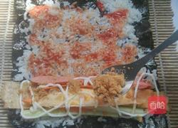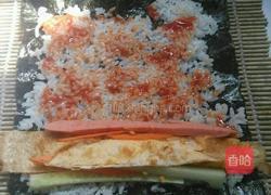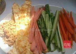 4.将胡萝卜,黄瓜,蛋皮,火腿肠个切成丝,并筹备好肉松。(肉松可加可不加)